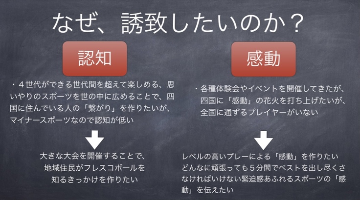 四国初、地域密着型の大会を開催して、フレスコボールを知ってもらい、感動を届けることで、スポーツを通して地域に変化を生み出す、新たなコミュニケーションが生まれるきっかけを作りたい!