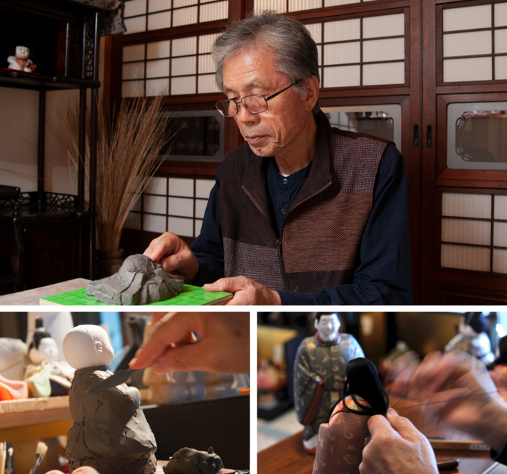 私は、中学生の頃から人形師の父を手伝っていました。縁があり15歳で、ある親方の元へ。修行を始めて3年ほどで、経営も手伝うようになりました。20歳のとき、親方が42歳の若さで急逝。遺された家族を放っておけず、人形づくりを一時中断して問屋業に精を出しました。後に親方の息子へ経営をバトンタッチし、晴れて人形師として独立をしました。