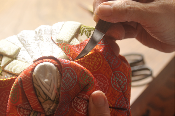 その後、布地を目打ちや木目込みへらを使い着崩れないようしっかりと木目込みをしていきます。