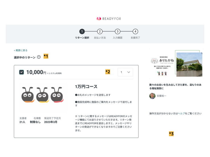 ※Please choose the3,000 yen,10,000 yen, 30,000 yen, 50,000 yen, 100,000 yen course. Other courses are not available for supporters living overseas.