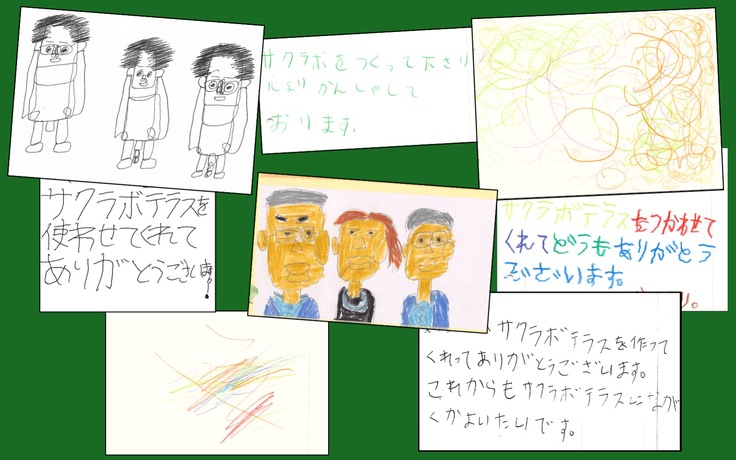 手紙は、上から時計回りの順で以下のとおり。「サクラボをつくって下さり、心よりかんしゃしております。」「サクラボテラスを使わせてくれてどうもありがとうございます。」「サクラボテラスを作ってくれってありがとうございます。これからもサクラボテラスにながくかよいたいです。」「サクラボテラスを使わせてくれてありがとうございます。!」
