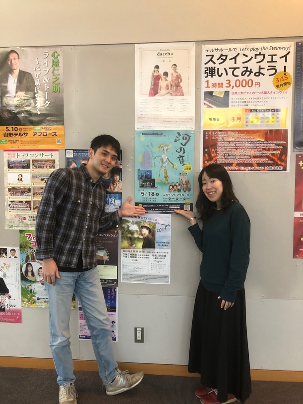 会場の山形テルサ・アプローズ前に貼ってあるポスターの前の大里さん(右)と池内さん(左)。池内さんのつま先が何度撮っても可愛いく上を向いているので・・・このまま載せてしまいます!