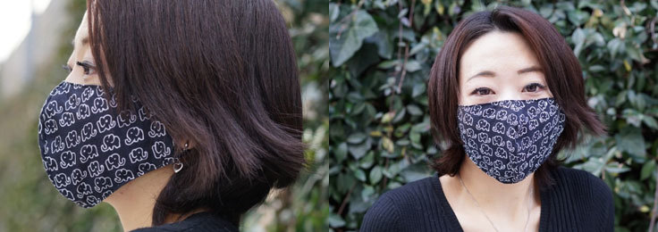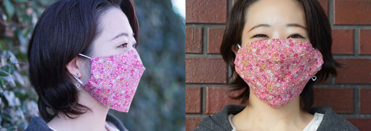 口紅がつきにくく息のしやすいボックス型で、ゴム紐は耳の痛くならない福井県産の「鯖江ゴム」を使用しています。