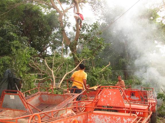 農機レンタルの作業の時だけでなく、農機倉庫の改修や掃除の時も私たちは一丸となって働きます。写真のとおり、マーケティング・オフィサー(営業)のエドワードは木に登って枝を切ってくれました。おかげで農機を保管するスペースがより広くなりました。