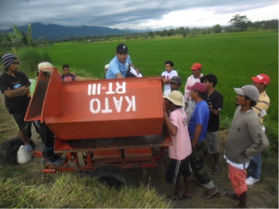 <脱穀機の研修を受ける農機オペレーター候補生たち>