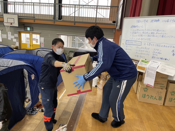 避難者のなかには高齢者も多く、「段ボールベッドが入ったことで本当に楽になった」との声も聞かれました。それに併せマウスウオッシュなどが入った独自の衛生セットやマスクを配布するなど、感染症のリスクを少しでも小さくし避難者の健康を守るために、できる限りの対策を講じています。
