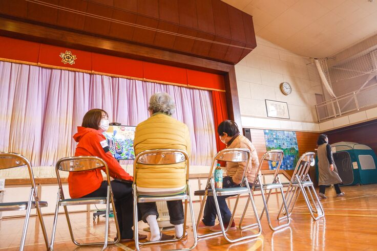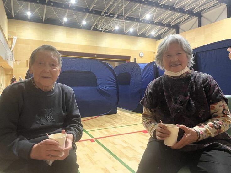 避難所のなかでは「はじめまして」という方も少なくありません。そこで不安を少しでも和らげ、避難者同士の交流になればと、空飛ぶ捜索医療団の看護師が“お茶っこ”を提案。