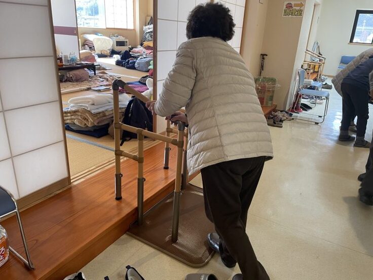 避難所支援では、特に年配の方への配慮が求められます。ある避難所では慣れない避難所生活で数名が転倒事故が起きていることが発覚。避難所には高齢者も多いことからすぐに避難所責任者と相談し、同日に業者と打ち合わせを行い、その翌日には転倒防止の手すりを設置しました。