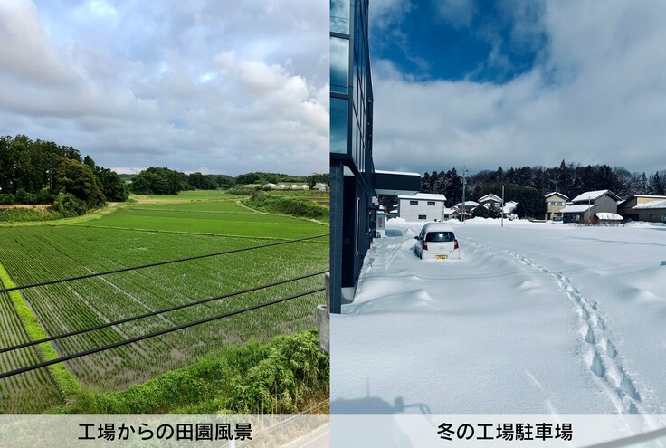 私達の工場は、人口 27,000人ほどの小さな町、福井県あわら市にあります。工場の窓からは、田舎ならではの田園風景が見え、また、豪雪地帯でもあるあわら市は、毎年数十センチの雪が積もり一面真っ白になることもしばしば。そんな四季折々の風景を楽しみながら、刺繍ワッペンを作っています。現在では、世界的に有名なファッションブランドや、上場企業のユニフォームの刺繍などを製作させて頂けるようになりました。