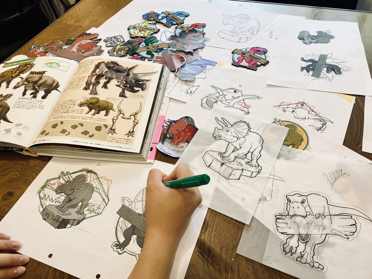 今回のプロジェクトで私たちが制作するのは”恐竜ワッペンキーホルダー”です。恐竜好きの子どもから大人まで気軽に身につけてもらいたいとの思いから、キーホルダーとして皆さまにお届けすることに決めました。