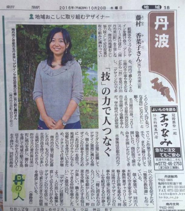 ページをご覧いただきありがとうございます。藤村香菜子と申します。愛知県名古屋市から、昔からの伝統を大切にしている「ものづくりのまち」京都府南丹市へ2015年に移住し、デザイン業を営む傍ら、地域おこし協力隊として活動をしています。
