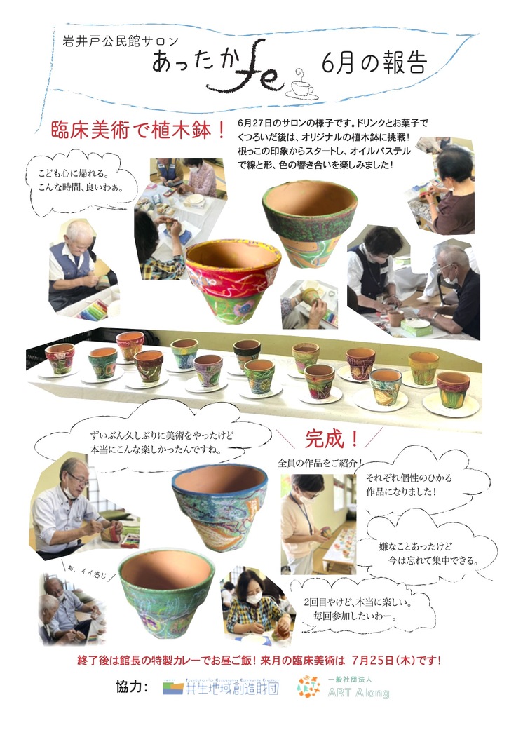 2022年6月に日本臨床美術協会認定の臨床美術士らによって京都で法人設立。京都<臨床美術>をすすめる会や、京都府立医科大学神経内科での講座14年の実績をもとに活動を展開。誰もが人生にアートを取り入れて命(Life)の味方にできる世界を目指して、ART Alongは臨床美術のワークショップや定期講座の受託など、あらゆる場面でのアート活動の実施サポートをさせていただきます。