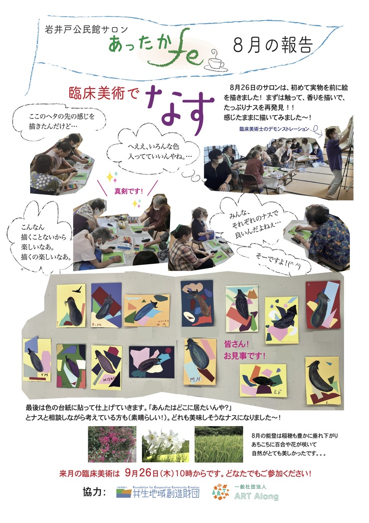 能登町にある岩井戸公民館では公益社団法人 共生地域創造財団の主催による「あったかfe」が、地域住民と仮設住宅入居者の交流を目的に始まろうとしており、私たちも毎月1回の臨床美術講座を開催させていただけることになりました。