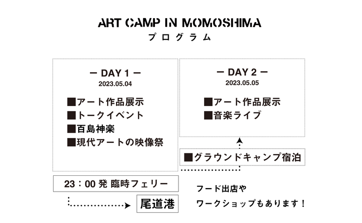 そこで今回は、2023年5月4日・5日の2日間で「ART CAMP IN MOMOSHIMA」開催を目指します!