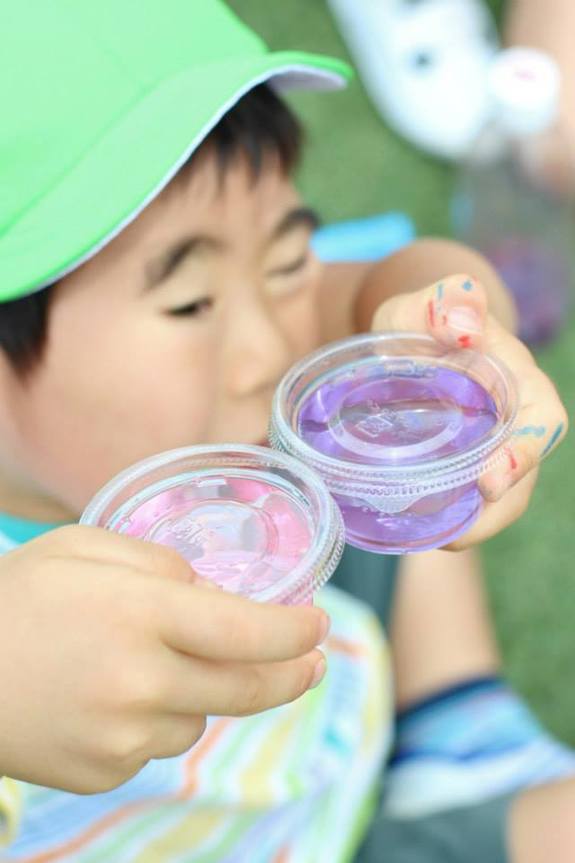 年齢別に取り組みかたも異なり、0〜1歳児さんは、透き通った色水の美しさを感じるだけでなく、モミモミと触れて感じることも。