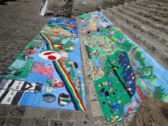 中世の街ナルニアの街角で日本の子どもたちとイタリアの子どもたちの壁画を展示しました。