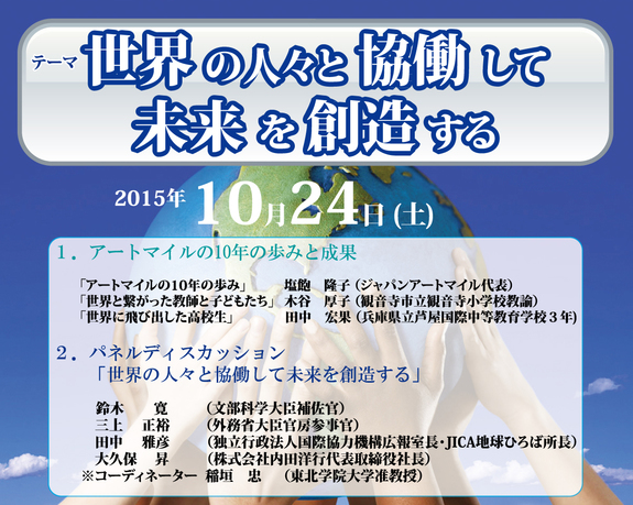 ジャパンアートマイルでは、10月24日(土)午後13:30~16:30に国立オリンピック記念青少年総合センター(東京都渋谷区)に於いて、ジャパンアートマイル10周年記念フォーラム「世界の人々と協働して未来を創造する」を開催します。