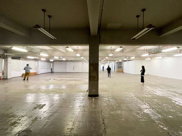 出展予定のギャラリー・アーティストのみなさんは、建物内を見て回り、測量をする中で、この大空間でどのような展示ができるのかを模索されていました。