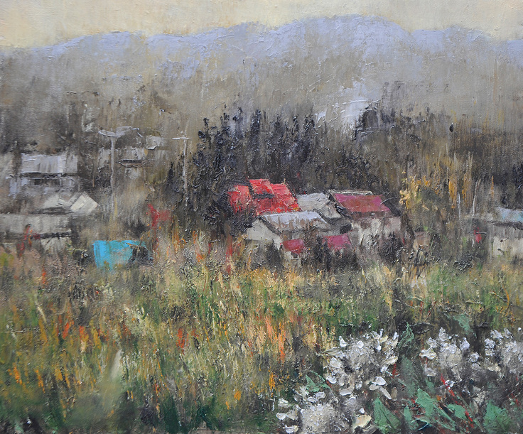 当時描いた集落を一望する坂道は、若木で視界が遮られ、同じ場所だと判断すらできない状況だった。