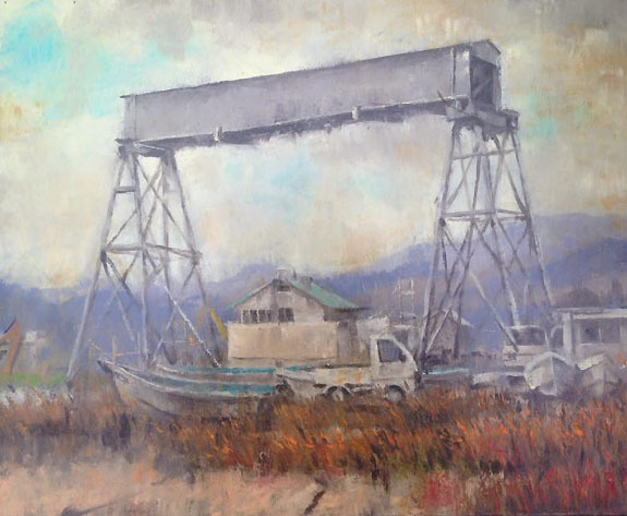 八岐大蛇(やまたのおろち)と付けた前作の題名は、気仙川の「夢の架け橋」を渡ったところから複数に分岐し、流れ落ちるコンベアの頭が大蛇の頭に見えたのをなぞらえてつけた題名でした。それならばこの絵は、コンベアが切断されたことを見立てこの言葉を追加するのが相応しいと感じ以下の副題を追加しました。