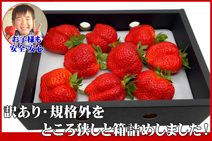 少し形が悪いだけの規格外!味はそのまま、たっぷり満足のあまおうを食べていただきたい♪