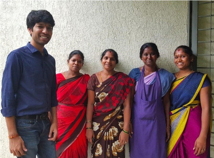ブックマイバイCEOアヌパム・シンハル氏と、同社サービスを利用する家事労働者の女性たちキャプション