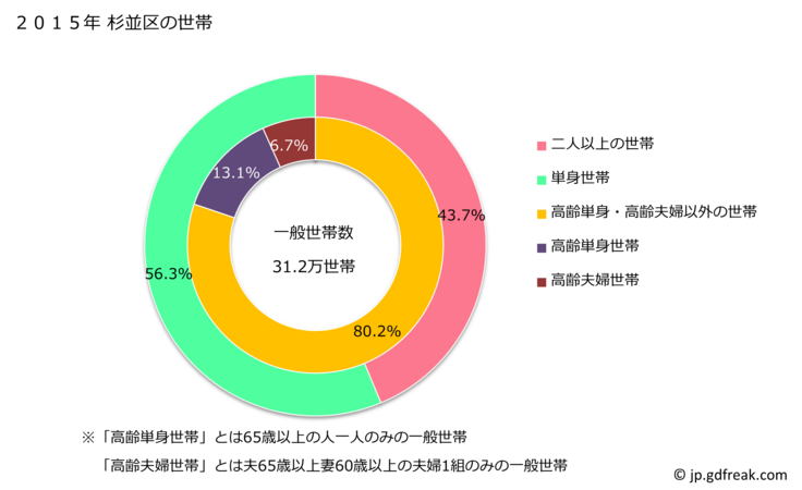 高齢者の一人住まいも増え、2015年に13.1%の単身高齢者世帯(下図:総務省国勢調査等からGDFreak 作成)も、杉並区が令和3年に策定した「杉並基本構想」によると、25年後の2040年には、急激に増えて60%位にもなると推定されています。既に高齢の私は、その頃どうなっているかわかりませんが、皆さんは…。