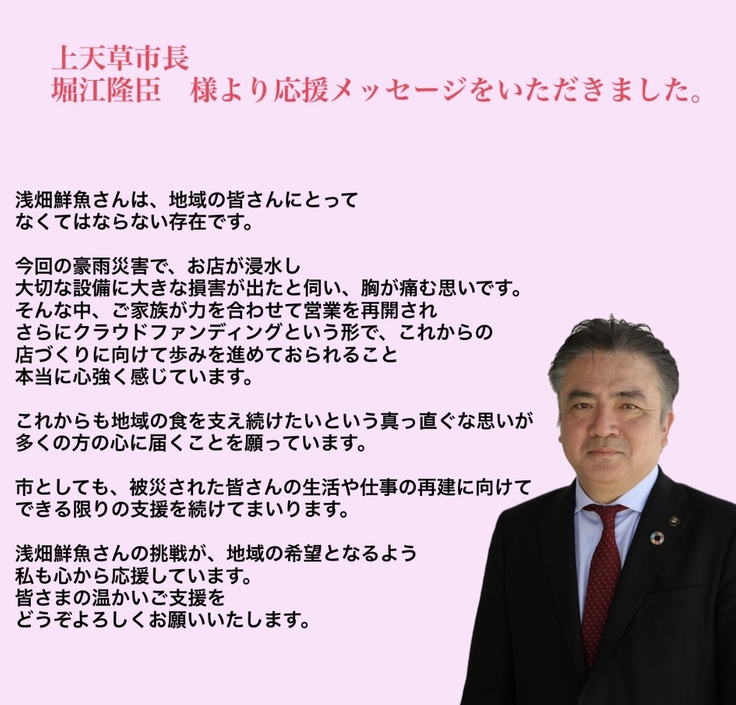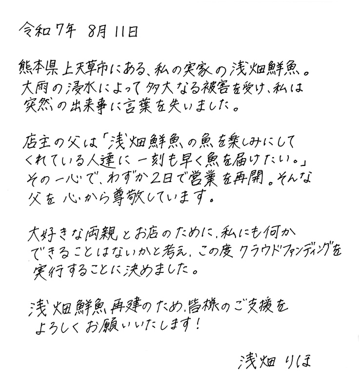 8月11日に熊本で起こった局地的な大雨による浸水被害を受けた有限会社浅畑鮮魚が、復旧するためのプロジェクトです。 集まったご支援は、以下の復旧費用に充てさせていただきます。 ・冷蔵庫・冷凍庫など大型機器の再購入:7,450,000円 ・浸水で全損した車両4台の買い替え:500,000円 ・店舗修繕/内装復旧工事費:1,250,000円 ・その他備品の再購入:700,000円 ・魚、店内で販売する乾物や土産品の仕入れ: 1,600,000円 ・廃棄物処理/清掃費用:500,000円 合計:12,000,000円
