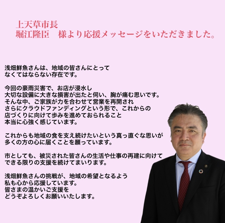また、今回クラウドファンディングをするにあたって、上天草市長へご連絡させていただいたところ、なんと市長より応援のメッセージをいただきました。