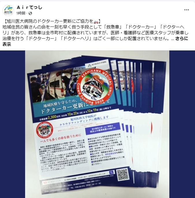 名寄市のコミュニティFM 「Airてっし」様 のSNSに、旭川医科大学病院ドクターカー更新クラウドファンディングを大きく取り上げていただきました。