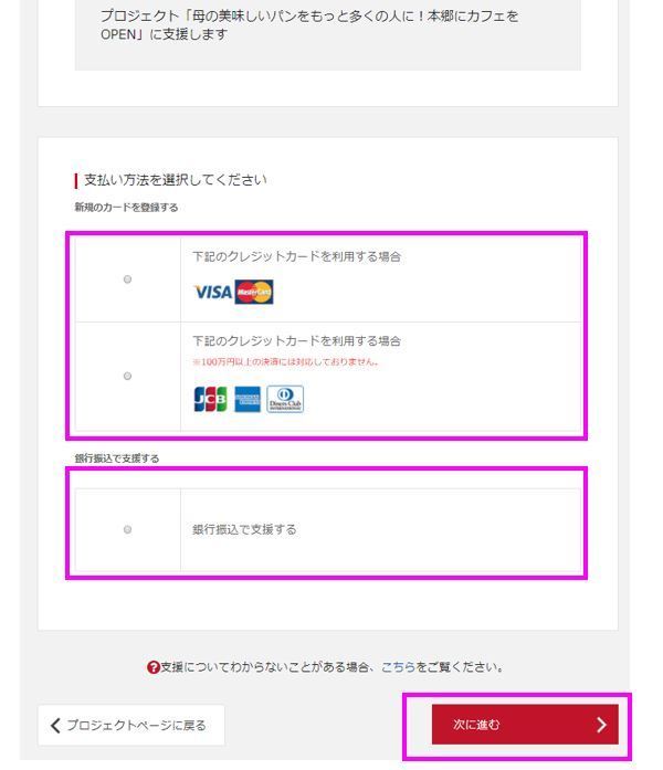 リターンを選択画面の下部に支払方法選択の画面があります。