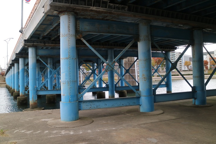 西中島・東中島の両町に新京橋が架かるまで、東方からの人々は西国街道から京橋を渡って岡山の街区を訪れていました。水色の幾何学的な橋脚に支えられた京橋は大正期に架橋されたもので、それまでは今より少し上流に架かる木橋でした。その太い橋脚の一部が今も河畔にモニュメントとして遺っています。水色の美しい橋の此岸と彼岸に栄えたのが京橋町と中島町でした。水の物語を幾重にも織りなしてきた岡山の表舞台だったのです。