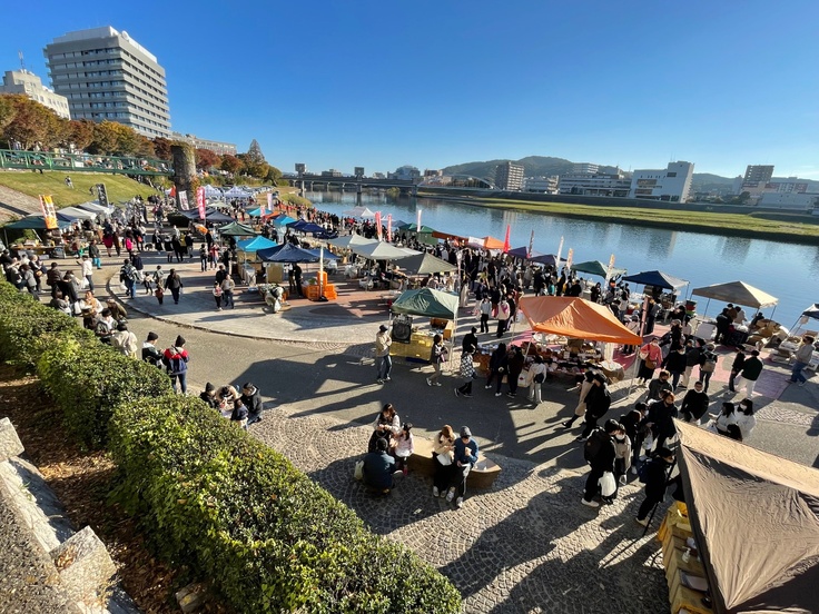 かつて橋本町が港町として栄えていた頃には、京橋の袂には数多くの鮮魚店が並んでいました。また、旭川河畔ののり面には雁木を設えた飲食店が港を利用する方々を迎えていました。それから幾時代を経た1989年平成元年に京橋朝市が始まりました。起ち上げは地元のまちづくりグループの有志が企画し、商工会議所なども協力して、「備前岡山京橋朝市」の名で毎月第一日曜日の早朝から催されてきました。旭川に架かる京橋北側の河川敷と河畔遊歩道を会場に農産物、鮮魚、食品、雑貨、衣料、食器などの店が並ぶほか、人気の飲食ブースも登場しています。