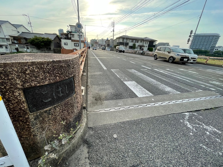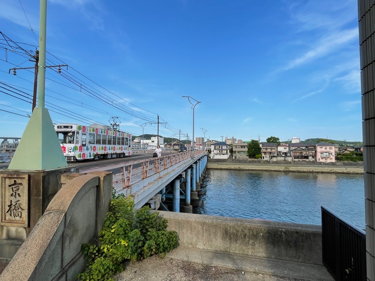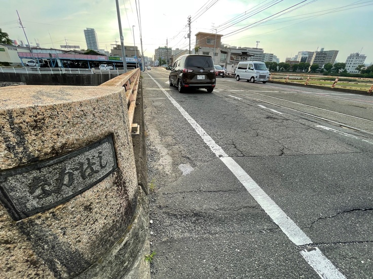 古くから東方より西国街道=山陽道を経て旭川に差しかかると、まず視界に入るのは川面の上流に見える岡山城です。安土桃山時代の宇喜多秀家も、江戸時代の池田光政も、旭川河畔の石山を右手に見ながら、小橋を渡り、東中島を抜け、中橋を経て、西中島に入り、京橋から城下へと歩みを進めたことでしょう。3橋は、洪水などを経て幾度も付け替えられてきたのでしょうが、そのよすがを橋の袂の石柱に伺うことができます。今は中央を路面電車が通り、両側を車が行き交いますが、どんな新型車両もこの橋を渡る時だけは昭和レトロなモチーフになってしまいます。