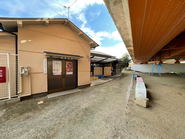 西中島町遊園地の横には公会堂が建っています。地域の方々にとっての集いの場となっています。定期的な会議のほかに有志による茶話会なども開かれています。全50世帯が集える大広間のほかに台所やトイレも兼備されています。岡山河畔芸術祭のプログラムでは、初年2022年に山崎樹一郎全作品の上映、次年2023年には尾上松之助出演の『忠臣蔵』と『児雷也』の2作品を上映しました。