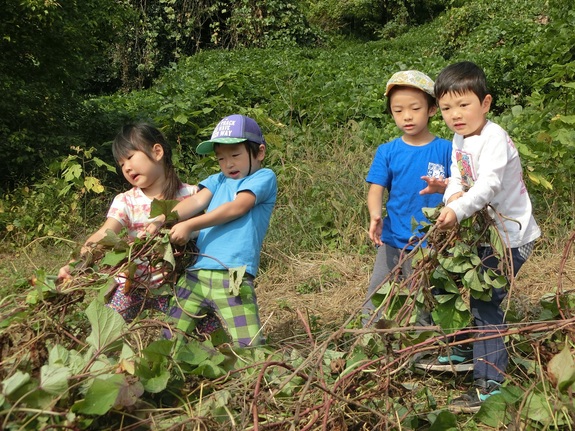 先日、4・5歳児「そらのこ組」と3歳児「やまのこ組」が合同でサツマイモの収穫に行ってきました。