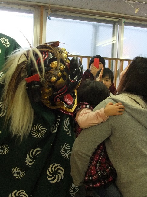 練り歩きを終えて園に戻ると、今度は本物のお獅子の登場!!その獅子頭をかぶるのは、秋保にある民族芸能を伝えるプロの団体“ほうねん座”の皆さん(その年によってお父さんたちが獅子頭をかぶることも)。集まった子どもたちの頭を次々に噛んで無病息災を願うのです。あまりの迫力と恐ろしさから涙する子も続出ですが、“元気に過ごせますように・・”“賢くなれますように・・”と願いをこめてわが子をお獅子にそっと差し出す父母たちの姿があちこちに見られます。
