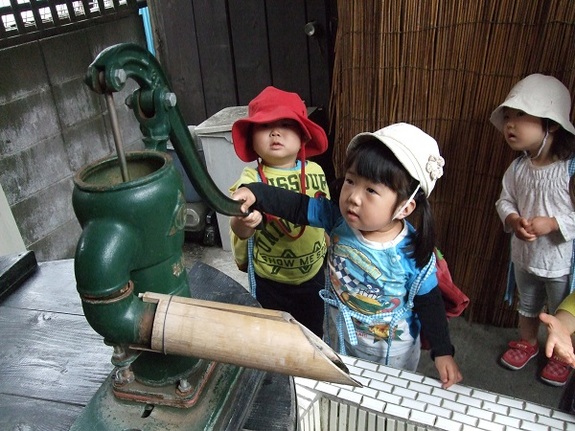 老舗のお茶屋さんの店先に並ぶアニメキャラクターのマスコット、小料理屋さんの前には鈴虫が、鶏肉専門店では金魚が飼われていたりと子どもたちの興味を引くものがいっぱい。2歳児クラスの子どもたちも「みせて、みせて」と体を寄せ合いぐいぐい入っていって、静かな空間は一気ににぎやかに。そして、いろは横町の名物、現役の古井戸へ足を進ませます。子どもたちで手押しポンプを動かすと、竜が描かれたタイル張りの洗い場に冷たい井戸水が勢いよく流れ出て、子どもたちはもちろん手を差し出し、井戸水に触れては歓声をあげます。