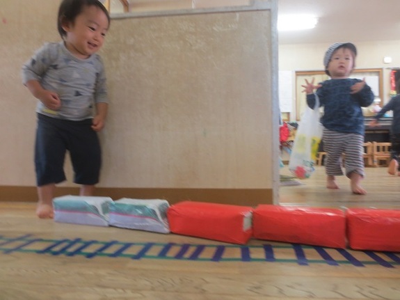 ついに、ビニールテープの線路は、どろんこ組の部屋を飛び出し、隣のかぜのこ組(2歳児)の部屋へと延び、そらのこ組(4.5歳児)の大きな大きなホールにまでも延びていきました。