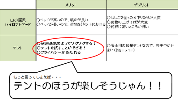 しかし以下の表ような、いろいろな課題(デメリット)があることも分かってきました。そして何より、このプロジェクトのきっかけになったのはお客様の、「テントのほうが楽しそう!」という一言です!