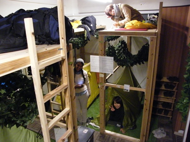 そのサービスの目玉のひとつに、日本初の屋内キャンプ場型ゲストハウスがあります。上述の日本ブランド専門の登山用品店の扱うキャンプ用品を試用してもらう形で、店内でキャンプ体験宿泊ができる画期的なサービスです!
