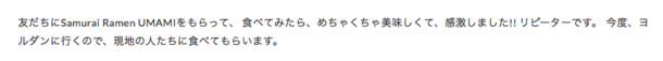 ご自宅でもSamurai Ramen UMAMIを楽しんで頂きたい!YATAIができるまでSamurai Ramen UMAMIを食べながら、オープンをお待ち頂きたい!とのことで、リターン商品にラーメンをチョイスしています。