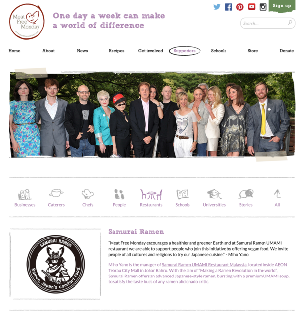この度、元ビートルズのポール・マッカートニー氏が地球環境保護などを目的として提唱している「MFM ミート・フリー・マンデー(MEAT FREE MONDAY)」のサポーターとしてSamurai Ramen UMAMIが登録されました!