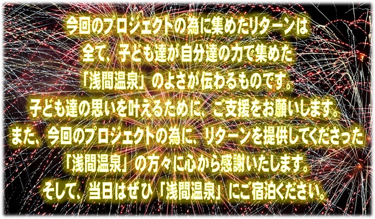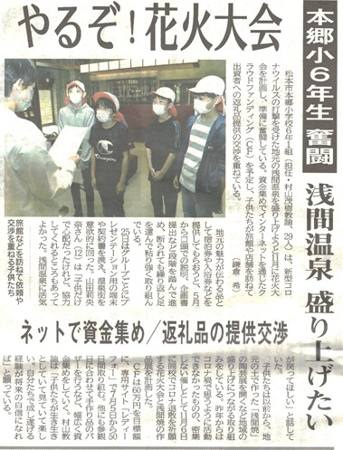 私たち、本郷小学校6年1組は、地元浅間温泉を盛り上げようと、小学校4年生の時から、様々な活動をしてきました。 小学校4年生の時には、地元にあった「浅間焼」を復刻して、展覧会を開催し、多くの方に浅間温泉について知ってもらう活動をしました。 5年生に進級し、「浅間焼展」や「お祭り」を開催することで、浅間温泉を盛り上げようと計画を立てましたが、新型コロナウイルスによる休校や感染防止対策の為、なかなか活動をすることができませんでした。そこで子ども達は、「お祭り」では人が集まってしまうけれど、「花火大会」なら遠くからも見ることができるし、浅間温泉の話題にもなると考え、「新型コロナウイルス退散祈願花火大会」を企画しました。当初、バザーや募金で資金を集めようと思いましたが、新型コロナウイルス対策の為、そのようなこともできませんでした。そこで、今回、クラウドファンディングで資金を集めることにしました