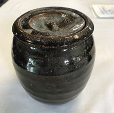 「浅間焼に使った土は、鉄分が多く、素焼きすると黒っぽくなり、その黒色を隠す為に、黒い飴のような釉薬を使ったんだよ。」