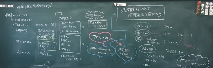 先週の「本郷の時間」のことです。4年1組で取り組んでいく、本郷の時間の題材が決まりました。下の写真は、その時間の黒板です。