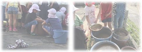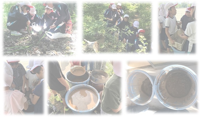 子ども達は「昔の人はすごいなぁ」と昔の人に想いを馳せながら、重い土を持って山を下ること約1時間。学校に着くと、その土から葉や枝、石などの不純物を取り除き、大きなポリバケツに投入。そこに大量の水を入れて攪拌しました。