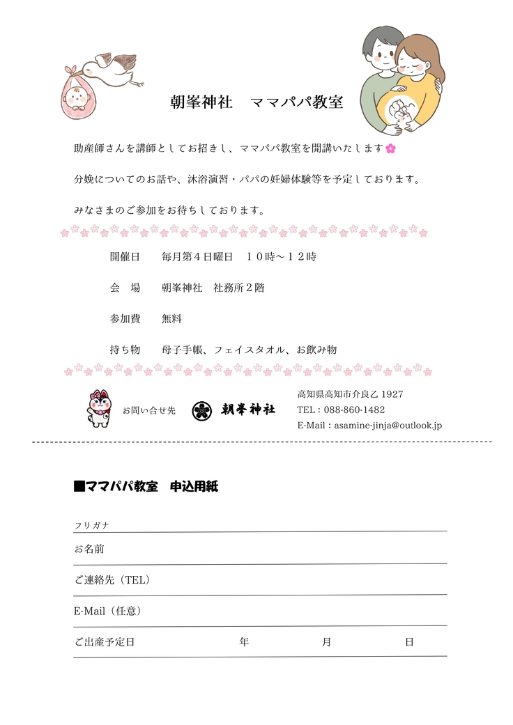 助産師さんを神社にお招きし、お産のお話や沐浴体験・パパの妊婦体験等を行う予定です🌸
