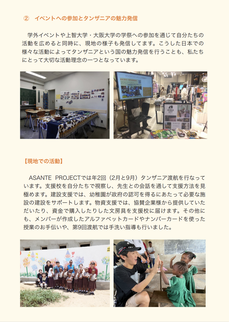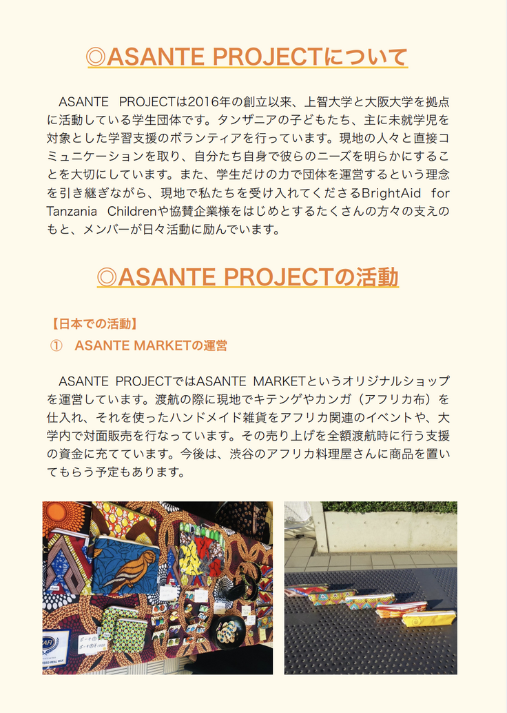 タンザニアの子どもたちの教育支援を目的に活動している学生団体です。 年2回の現地渡航とASANTE MARKETの運営を中心に活動しています。 日々の活動の様子や団体についてはホームページやインスタグラムをぜひご覧ください! Instagram▷▶▷▶東京本部 https://www.instagram.com/asanteproject 大阪支部 https://www.instagram.com/asanteprojectosaka