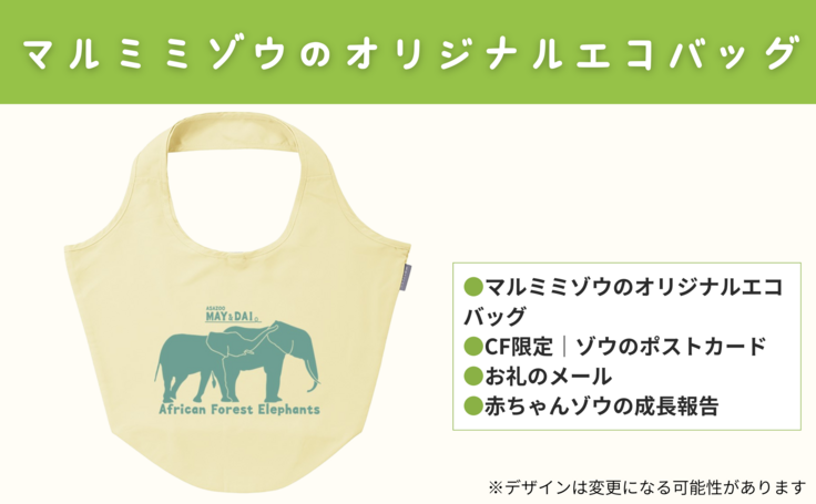 特に、「マルミミゾウのオリジナルエコバック」コースに多くの支援をいただいており、公開初日にして完売となりました。改めて心よりお礼申し上げます。